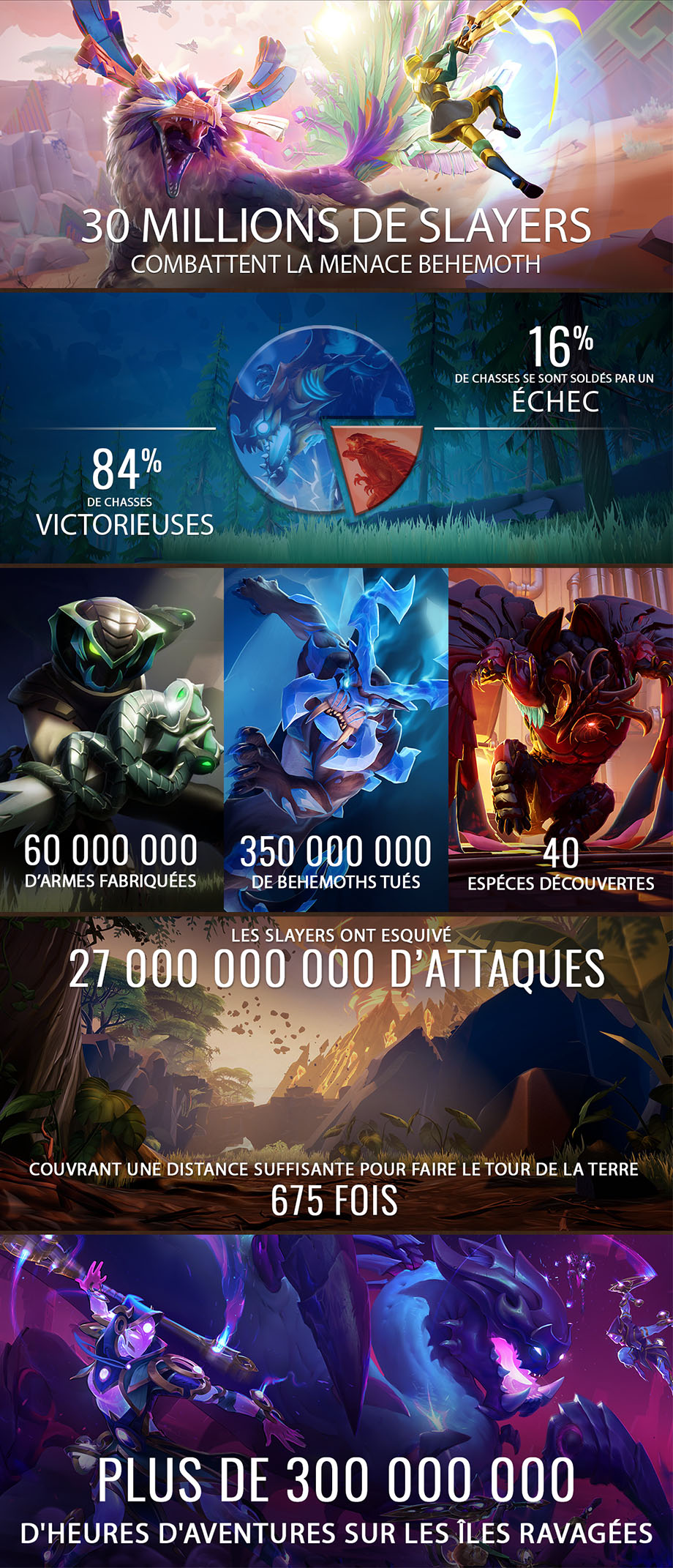 Plus de 30 millions de Slayers ont passé plus de 300 millions d’heures à s’aventurer dans les Îles ravagées. Ensemble, nous avons vaincu 40 Behemoths élémentaires, réalisé 5 Ascensions et maîtrisé des centaines d’armes puissantes. Nous sommes vraiment fiers de tout ce que nous avons accompli jusqu’ici à vos côtés !
