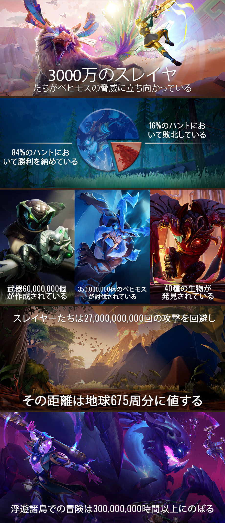 スレイヤー3千万人 以上が 3億時間 以上を浮遊諸島での冒険で過ごしている。我々は共に 40種の属性ベヒモス を討伐し、 5種のドキドキするエスカレーション に挑み、 数百もの強力な武器 の扱いを極めてきた。 諸君と一緒に 成し遂げてきたことすべてを非常に誇らしく思うぞ!