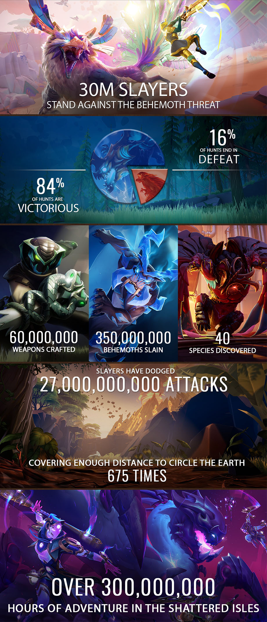 More than 30 million Slayers have spent upwards of 300 million hours adventuring in the Shattered Isles. Together, we’ve conquered 40 elemental Behemoths, climbed 5 vibrant escalations, and mastered hundreds of powerful weapons. We are so proud of everything we have achieved together with you!